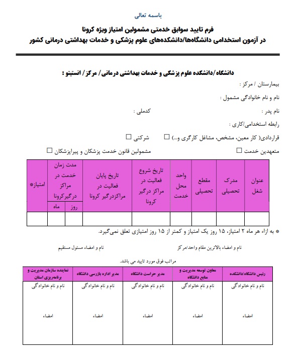 نکته: داوطلبی که محل خدمت ایشان در زمان شیوع کرونا در سایر دانشگاه ها بوده می بایست فرم مربوطه را پس از تایید آن دانشگاه طی نامه ای به دانشگاه علوم پزشکی رفسنجان واحد استخدام تحویل دهند.