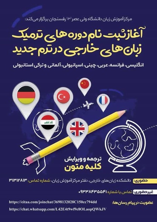 ثبت نام دوره های ترمیک مرکز آموزش زبان دانشگاه ولی عصر (عج) رفسنجان با همکاری دفتر روابط بین الملل دانشگاه علوم پزشکی رفسنجان با تخفیف ویژه برای ترم جدید تا24 مهرماه تمدید شد