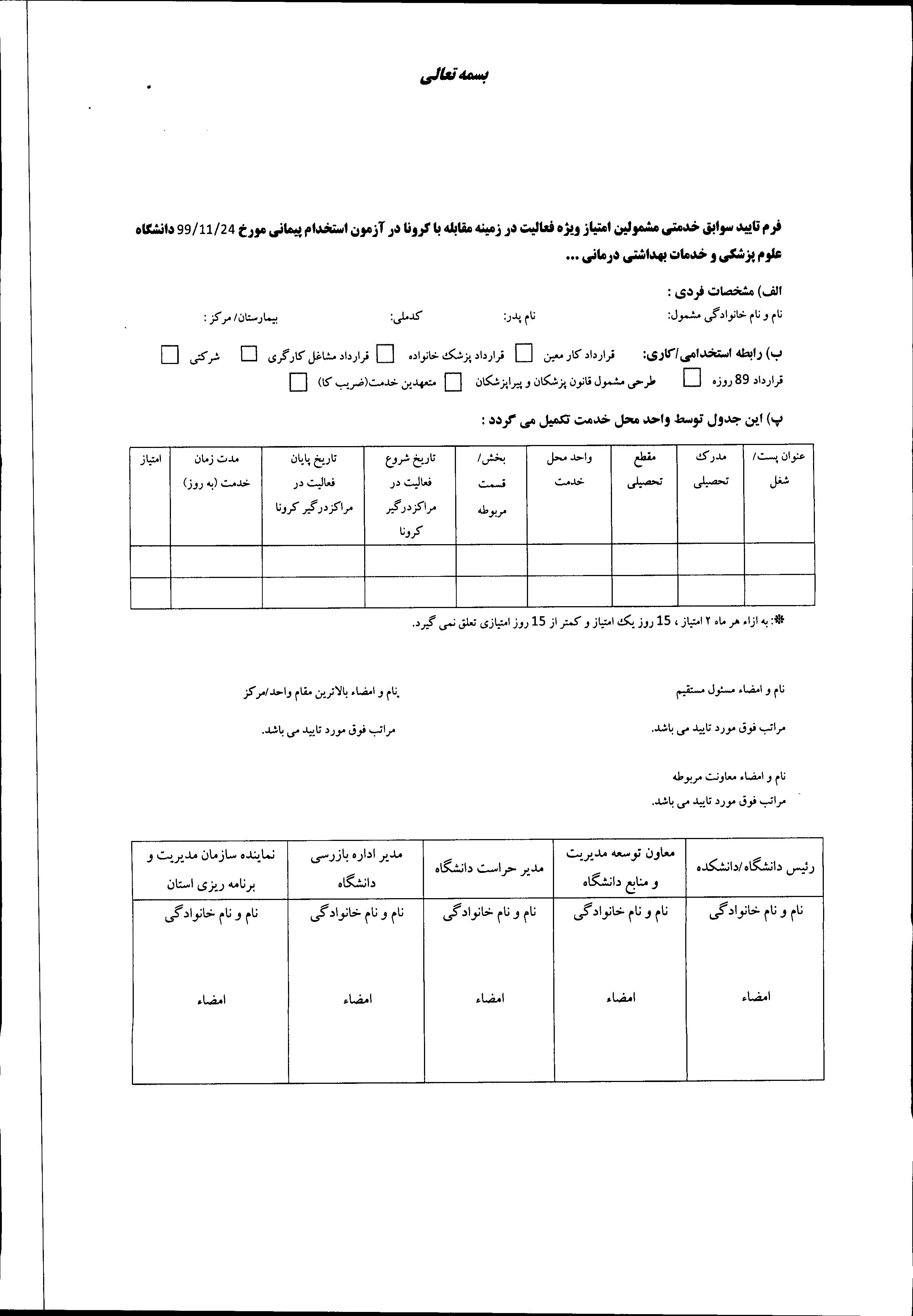13) فرم تایید سوابق خدمتی مشمولین امتیازات مبارزه با کرونا( مختص افرادی که در مقابله مستقیم با کرونا و درمان بیماری کرونا انجام وظیفه نموده اند )