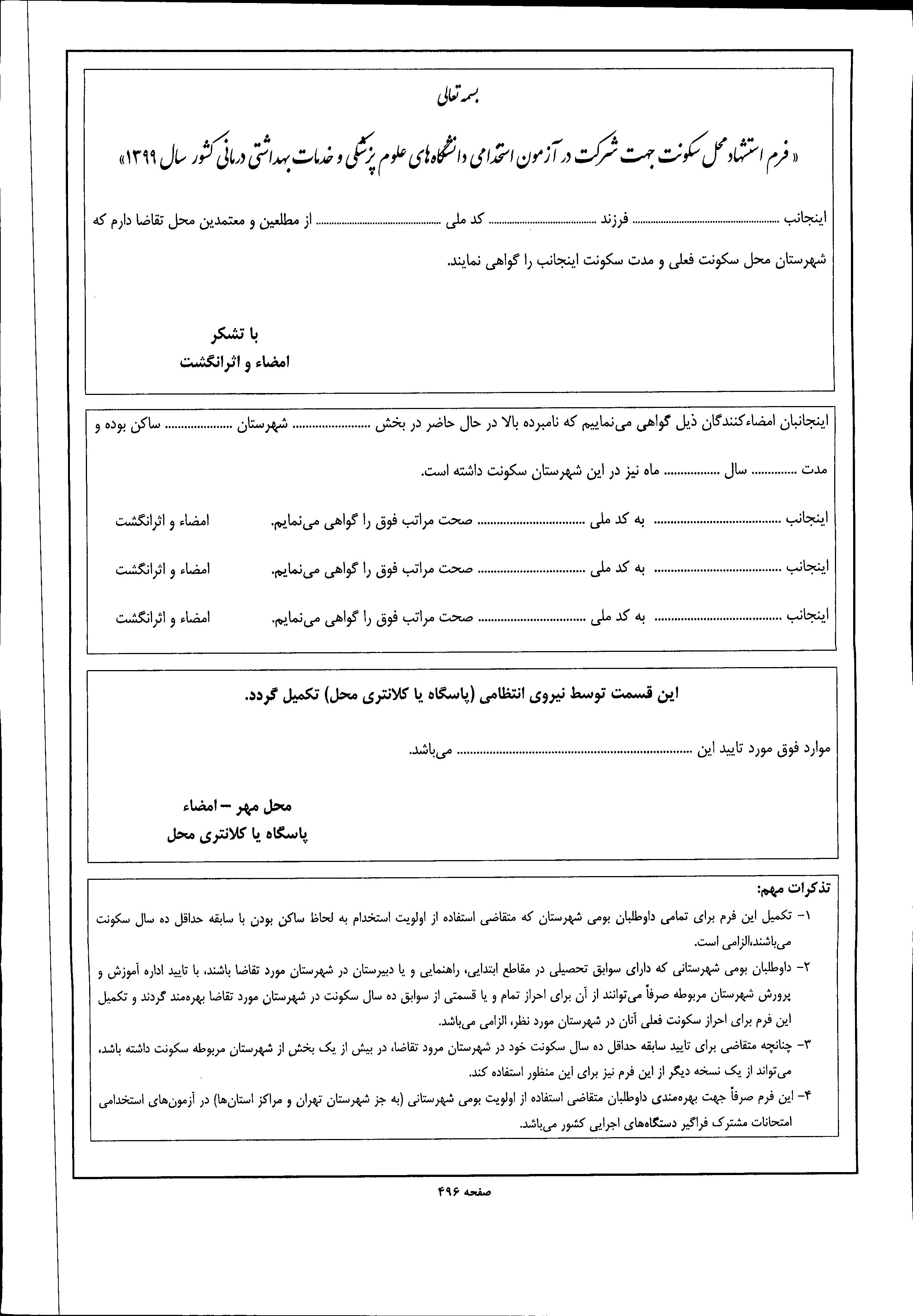 (توضیح بند ب متن آگهی: سکونت داوطلب به مدت حداقل ده سال با ارائه استشهاد محلی ( بر اساس فرم پیوست مندرج در ص 496 متن آگهی ) ممهور به مهر نیروی انتظامی (پایگاه یا کلانتری محل) احراز گردد.)