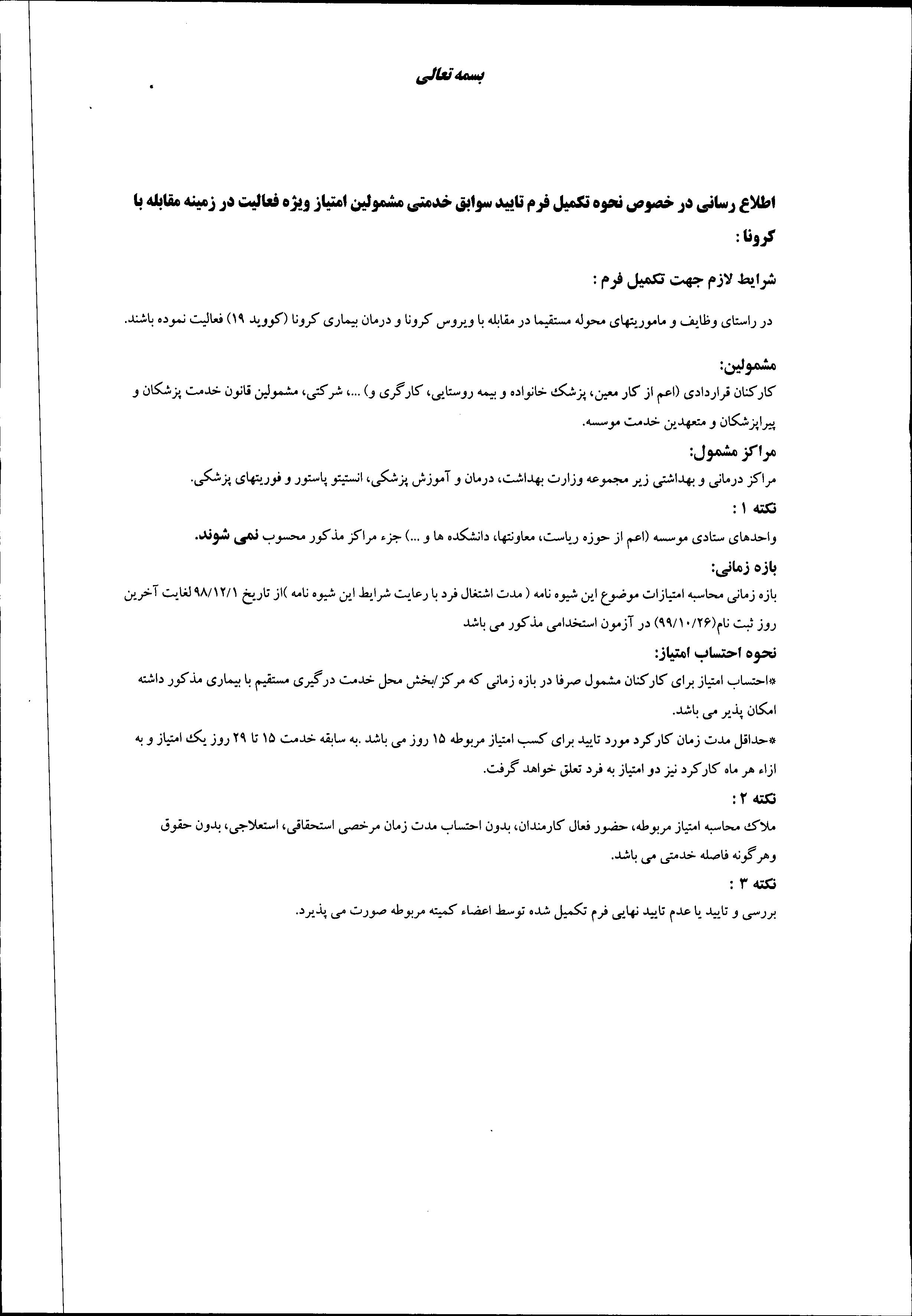 تذکر 2- چنانچه داوطلبی درواحدهای درگیرمبارزه مستقیم با بیماری کرونا در سایرد دانشگاهها یا موسسات وابسته به وزارت بهداشت درمان و آموزش پزشکی خدمت نموده باشد بایستی فرم تایید سوابق را پس از تایید دانشگاه مربوطه طی نامه مکتوب به واحد استخدام ارائه نماید.