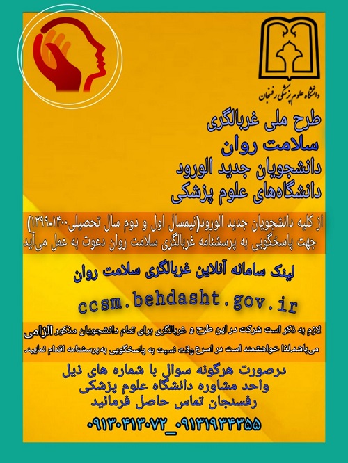 طرح ملی غربالگیری سلامت روان دانشجویان جدیدالورود گروه خبری : اطلاعیه کد خبر : 11507 کپی لینک کوتاه کلمات کلیدی