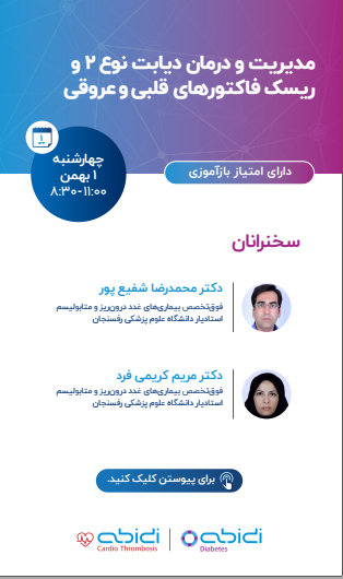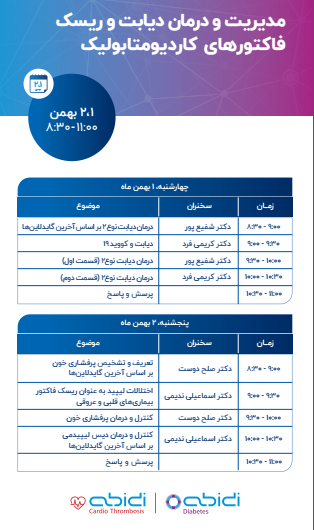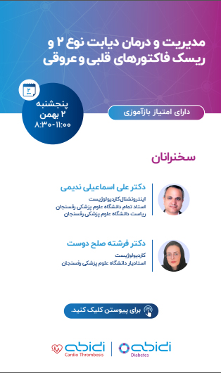 مدیریت و درمان دیابت نوع 2 و ریسک فاکتورهای قلبی و عروقی دارای امتیاز باز آموزی زمان : اول و دوم بهمن ماه دارای امتیاز باز آموزی جهت کسب اطلاعات بیشتر اینجا کلیک کنید. گروه خبری : اطلاعیه کد خبر : 11402 کپی لینک کوتاه کلمات کلیدی
