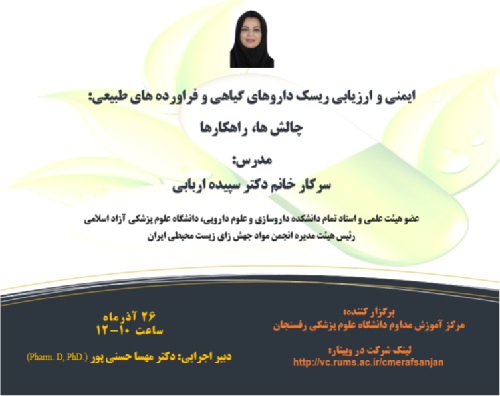 " ایمنی وارزیابی ریسک داروهای گیاهی وفراورده های طبیعی " دارای امتیاز بازآموزی ویژه پزشکان عمومی،کلیه مقاطع داروسازی،دکترای سم شناسی و دکترای فارماکولوژی