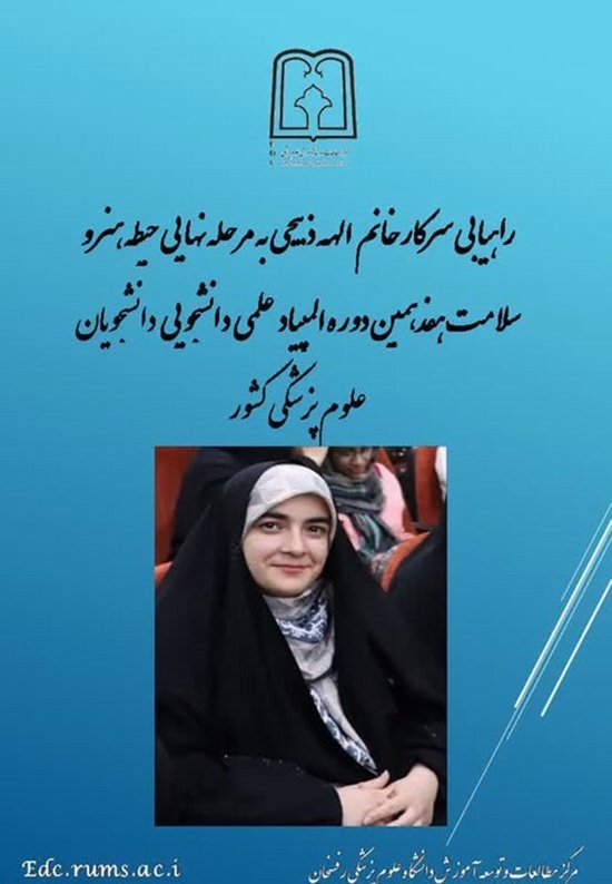 وی ادامه داد: در این آزمون دانشجوی رشته هوشبری دانشگاه علوم پزشکی رفسنجان، به نام الهه ذبیحی جلالی موفق به صعود به مرحله نهایی رقابت‌های کشوری درحیطه سلامت و رسانه شد.